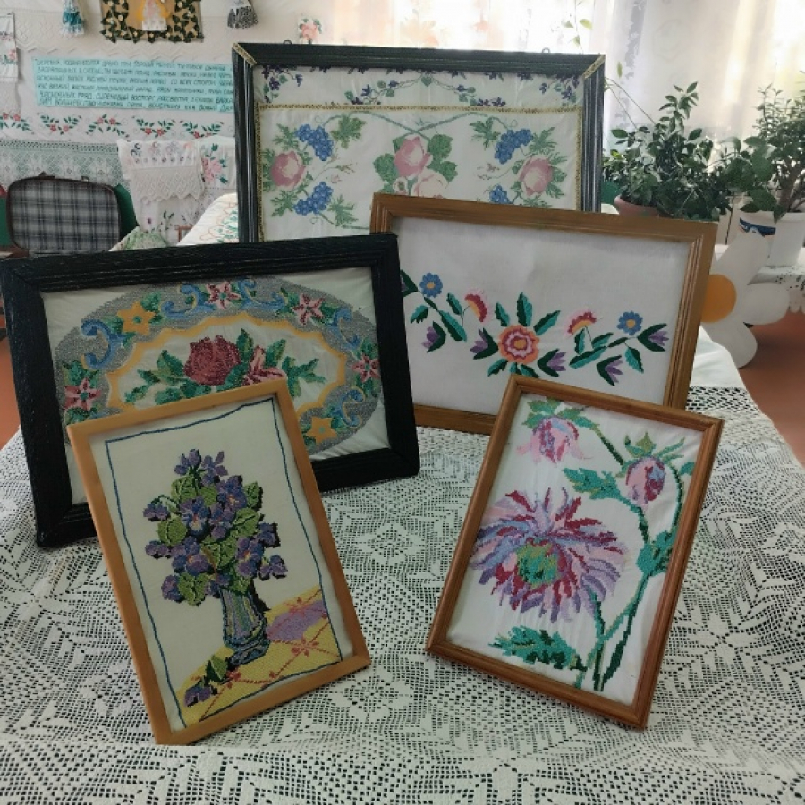 В современном мире интерьер домов можно украсить любым дизайном на свой вкус и цвет. Наши далёкие бабушки тоже старались создать уют в своих семейных очагах. Как же они это делали? Занимались рукоделием. Вышивали, ткали, вязали. Прежде чем начать работу, мы вспомнили художественныенародные промыслы, очень тщательно изучили традиции этого ремесла и уже затем, основательно подготовившись, а работы было немало — это реставрация старинных рам и вышивок, создали украшение для дома — вышитые картины. Такие картины висели в простенках между окон. Они играли красками, притягивали взор, создавали уют и несли теплую радость. Вот, казалось бы, нити макраме, белая ткань, умение и мастерство женских рук, а такая красота получилась. Вышиты картины нашими далёкими бабушками, и лет им уже немало, рамки из того же подвала купеческого дома, украшать они будут музей нашего сельского клуба.